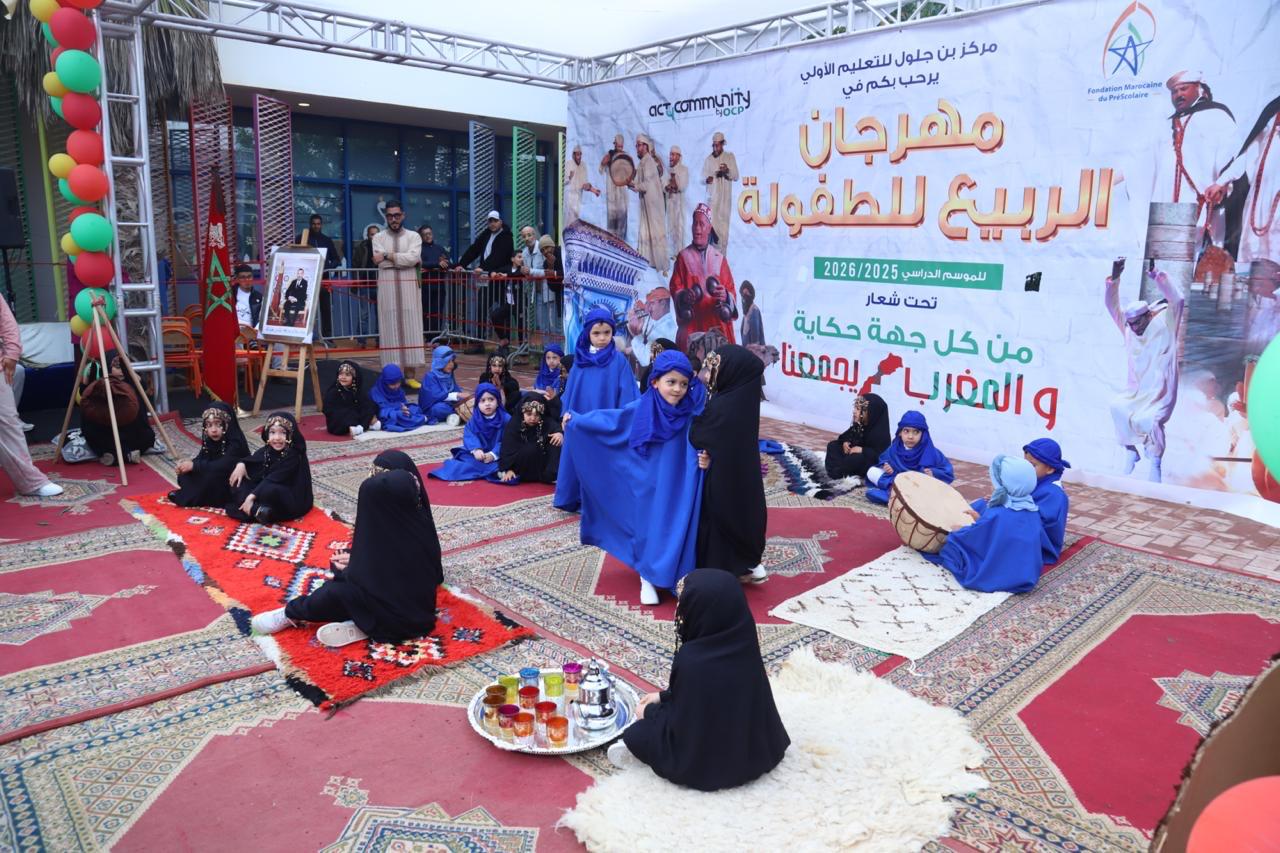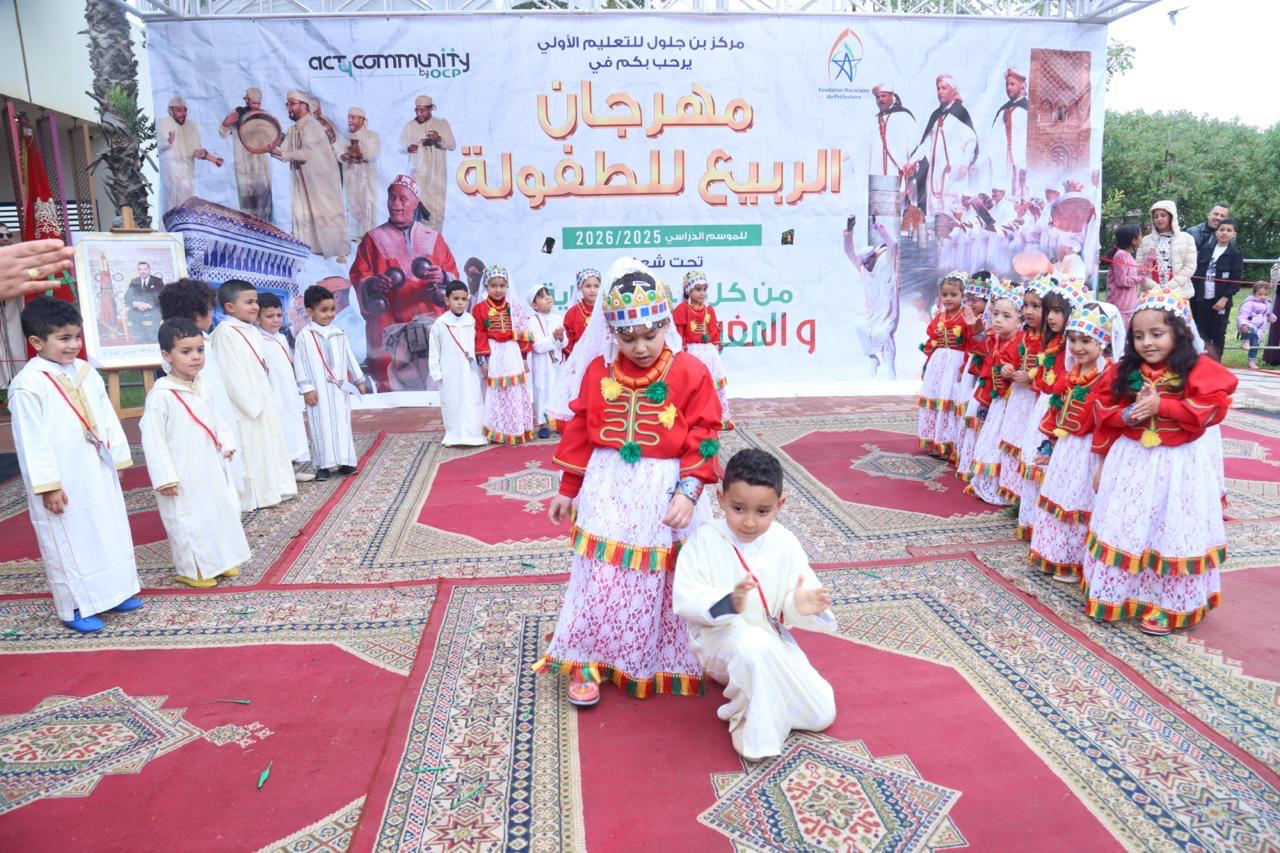 احتضن مركز بن جلول للتعليم الأولي بمدينة خريبكة، يوم الجمعة 10 أبريل 2026، فعاليات "مهرجان الربيع للطفولة"، في تظاهرة تربوية وفنية متميزة جسد خلالها الأطفال، من خلال الأزياء والعروض التراثية واللوحات التعبيرية، غنى الثقافة المغربية وتنوعها، في أجواء احتفالية طبعتها البهجة وروح الانتماء. ويندرج تنظيم هذا الحدث ضمن الشراكة التي تجمع بين المؤسسة المغربية للنهوض بالتعليم الأولي (FMPS) والمجمع الشريف للفوسفاط عبر Act4Community Khouribga، وهي شراكة تروم دعم المبادرات التربوية والثقافية الموجهة للأطفال، وتعزيز انفتاح المؤسسة التعليمية على محيطها الاجتماعي والثقافي. وقد أقيم هذا المهرجان تحت شعار "من كل جهة حكاية.. والمغرب يجمعنا"، في ترجمة رمزية لرسالة تربوية عميقة تروم ترسيخ قيم الوحدة الوطنية في ظل التنوع الثقافي الذي تزخر به مختلف جهات المملكة. وشهدت فقرات المهرجان، الذي انطلقت فعالياته على الساعة الثالثة بعد الزوال، تقديم عروض متميزة عكست تمثيلًا جميلًا لعدد من المدن والمناطق المغربية، حيث تألق الأطفال في ارتداء أزياء تقليدية مستوحاة من التراث المحلي، وقدموا لوحات فنية وحركية استحضرت العادات والتقاليد والخصوصيات الثقافية التي تميز المغرب من شماله إلى جنوبه ومن شرقه إلى غربه. ومن أبرز لحظات هذا الموعد التربوي، العروض الجماعية التي قدمها الأطفال بثقة وعفوية، مجسدين من خلالها مشاهد تراثية وفنية أبانت عن حسن التأطير والتنظيم، كما عكست حجم المجهود المبذول من طرف الأطر التربوية والإدارية في إعداد هذه التظاهرة وإنجاحها. ولم يكن المهرجان مجرد مناسبة للفرجة والاحتفال، بل شكل أيضًا محطة تربوية ساهمت في تعزيز ثقة الطفل بنفسه، وتنمية حسه الإبداعي، وتقوية ارتباطه بهويته الثقافية والوطنية.