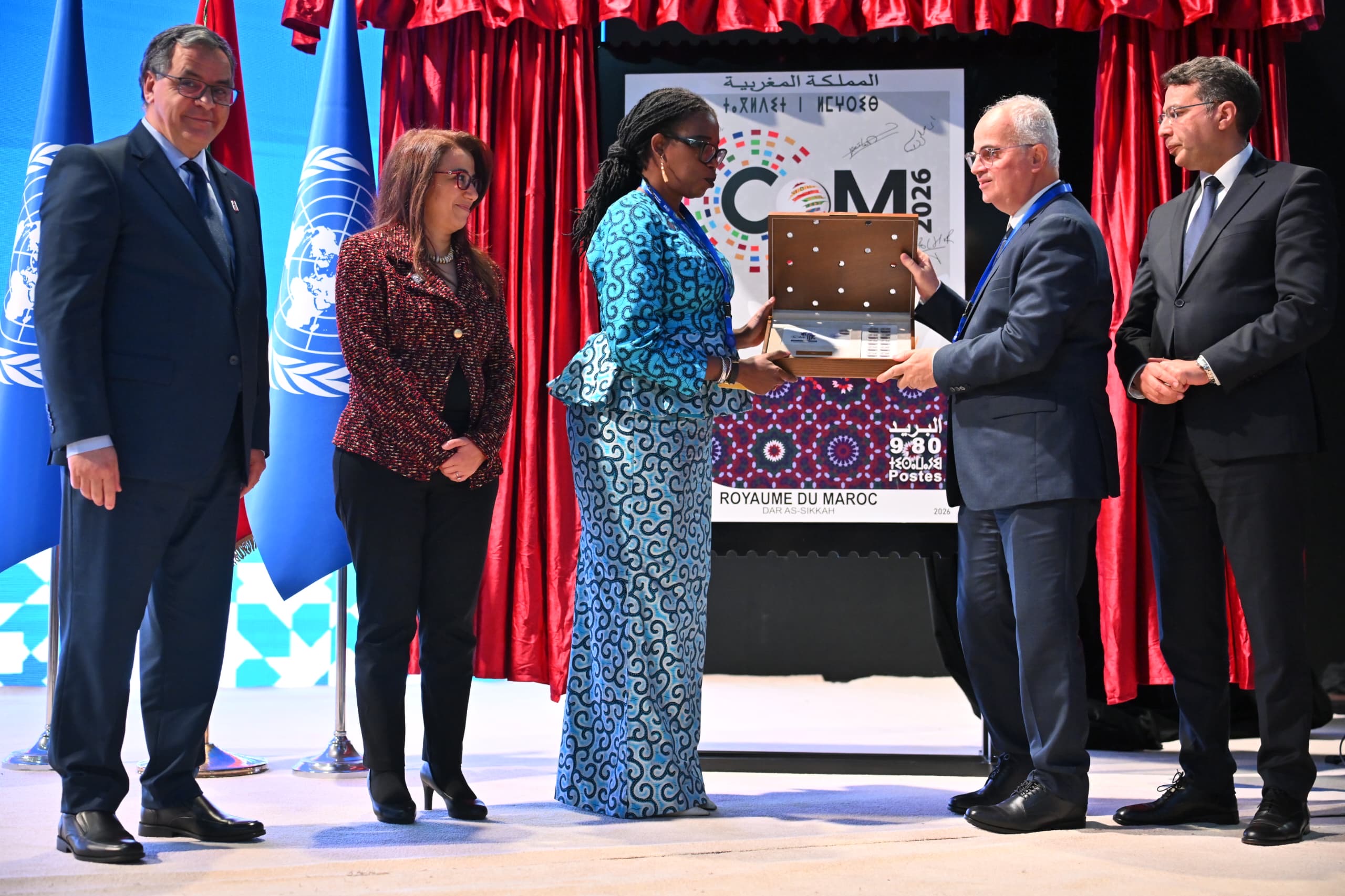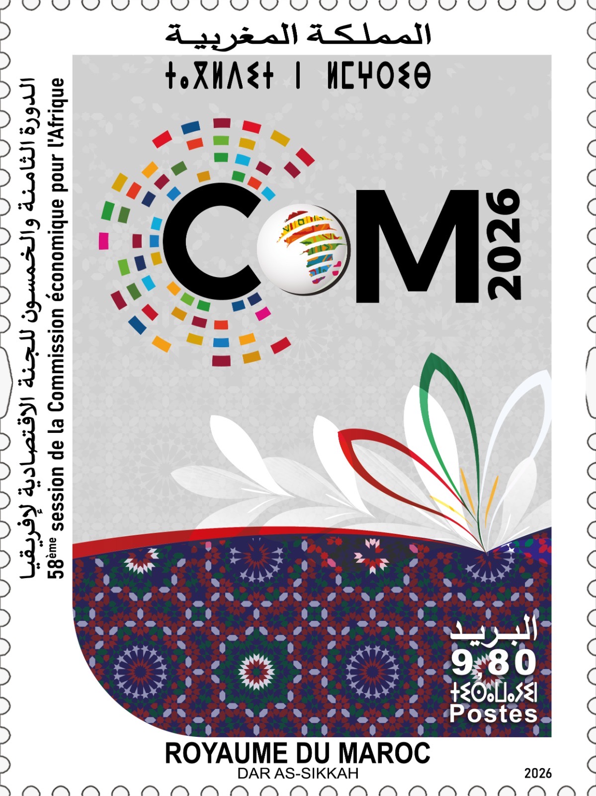 بمناسبة استضافة المملكة المغربية للدورة الثامنة والخمسين للجنة الاقتصادية لإفريقيا التابعة للأمم المتحدة (CEA)، ومؤتمر وزراء المالية والتخطيط والتنمية الاقتصادية الأفارقة (COM2026)، المزمع تنظيمهما من 28 مارس إلى 3 أبريل 2026 بمدينة طنجة، يعلن بريد المغرب، بشراكة مع اللجنة الاقتصادية لإفريقيا، عن إصدار طابع بريدي تذكاري مخصص لهذا الحدث القاري البارز. وأُقيم حفل الكشف عن هذا الإصدار الخاص اليوم السبت 28 مارس 2026 بمدينة طنجة، بحضور السيد أمين بنجلون التويمي، المدير العام لمجموعة بريد المغرب، والسيدة ماما كيتا، نائبة الأمين التنفيذي للجنة الاقتصادية لإفريقيا المكلفة بدعم البرامج، إلى جانب السيدة حنان مرسي، نائبة الأمين التنفيذي للجنة الاقتصادية لإفريقيا المكلفة بالبرامج، والسيد محمد طارق بشير، رئيس لجنة الخبراء التابعة للجنة الاقتصادية لإفريقيا ومدير الخزينة والمالية الخارجية بوزارة الاقتصاد والمالية، وسعادة السيد محمد عروشي، السفير الممثل الدائم للمملكة المغربية لدى اللجنة الاقتصادية لإفريقيا.