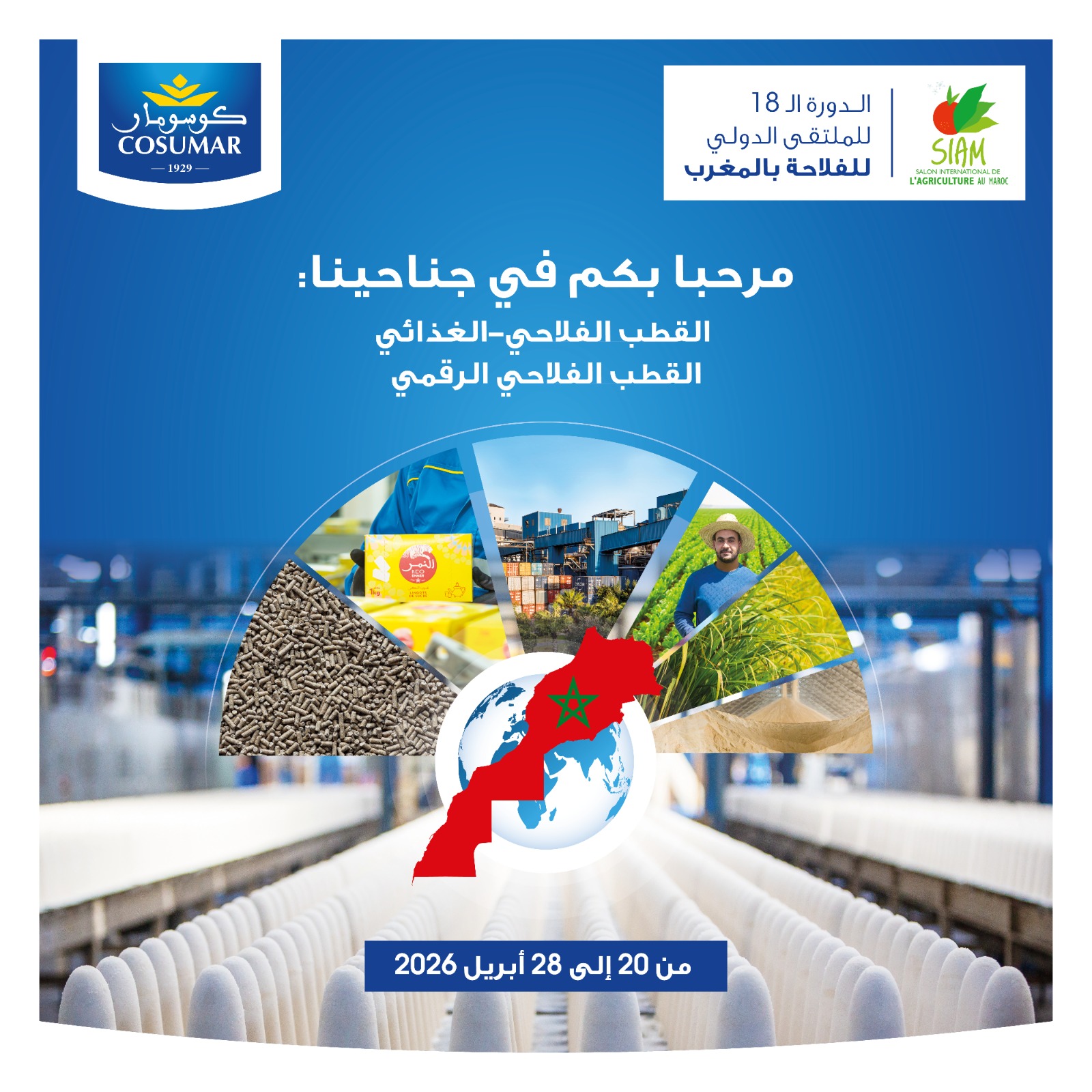 تشارك كوسومار في فعاليات المعرض الدولي للفلاحة بالمغرب (SIAM 2026)، المنعقد خلال الفترة ما بين 20 و28 أبريل الجاري، تحت شعار «استدامة الإنتاج الحيواني والسيادة الغذائية».