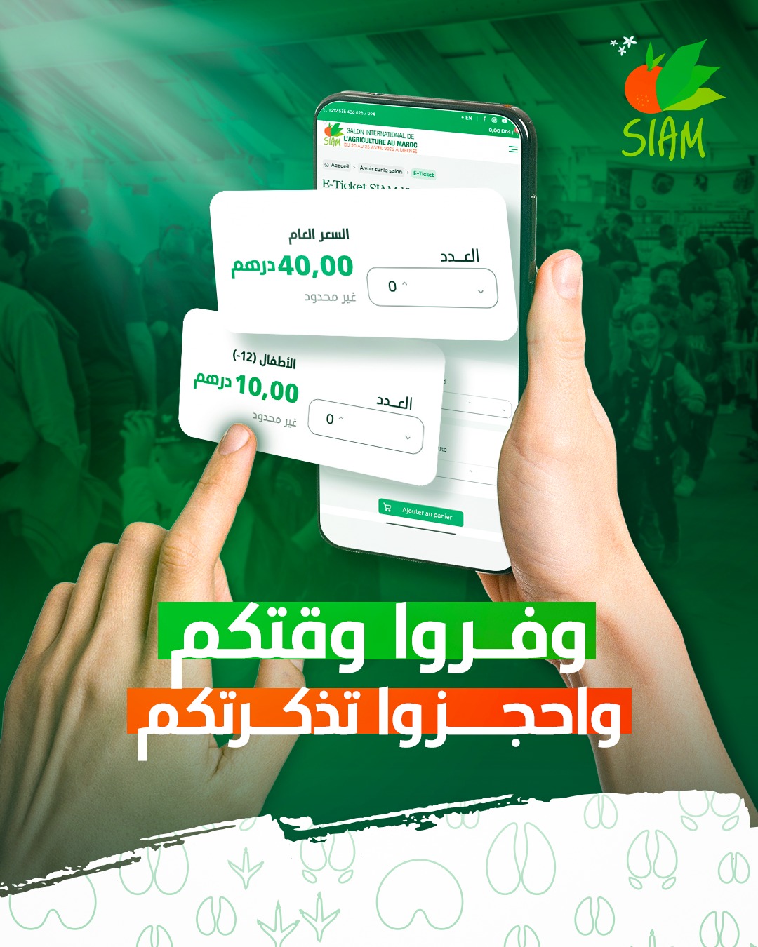 أعلنت الجهة المنظمة لـ المعرض الدولي للفلاحة بالمغرب (SIAM 2026) عن تحديد أسعار تذاكر ولوج فضاءات المعرض في 40 درهما للكبار و10 دراهم للأطفال، وذلك تزامنا مع انطلاق فعاليات دورته الثامنة عشرة.