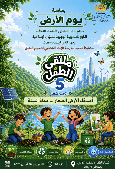 ينظم مركز التوثيق والأنشطة الثقافية التابع المندوبية الجهوية للشؤون الإسلامية بجهة الدار البيضاء-سطات، بشراكة مع تلاميذ مدرسة الإمام الشاطبي للتعليم العتيق، يوم الخميس 30 أبريل 2026، فعاليات الدورة الخامسة لملتقى الطفل، تحت شعار "أصدقاء الأرض الصغار... حماة البيئة".
