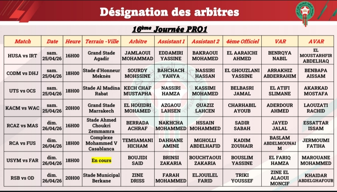 أعلنت الجامعة الملكية المغربية لكرة القدم عن قائمة حكام مباريات الدورة 16 من البطولة الوطنية الاحترافية. وستنطلق مباريات الدورة 16 لموسم 2025-2026، ابتداء من السبت 25 أبريل إلى غاية الأحد 26 أبريل 2026. وفي مايلي لائحة المباريات والحكام: