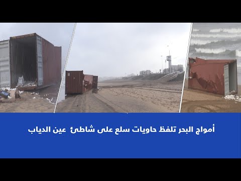 أمواج البحر تلفظ حاويات سلع على شاطئ عين الدياب | |